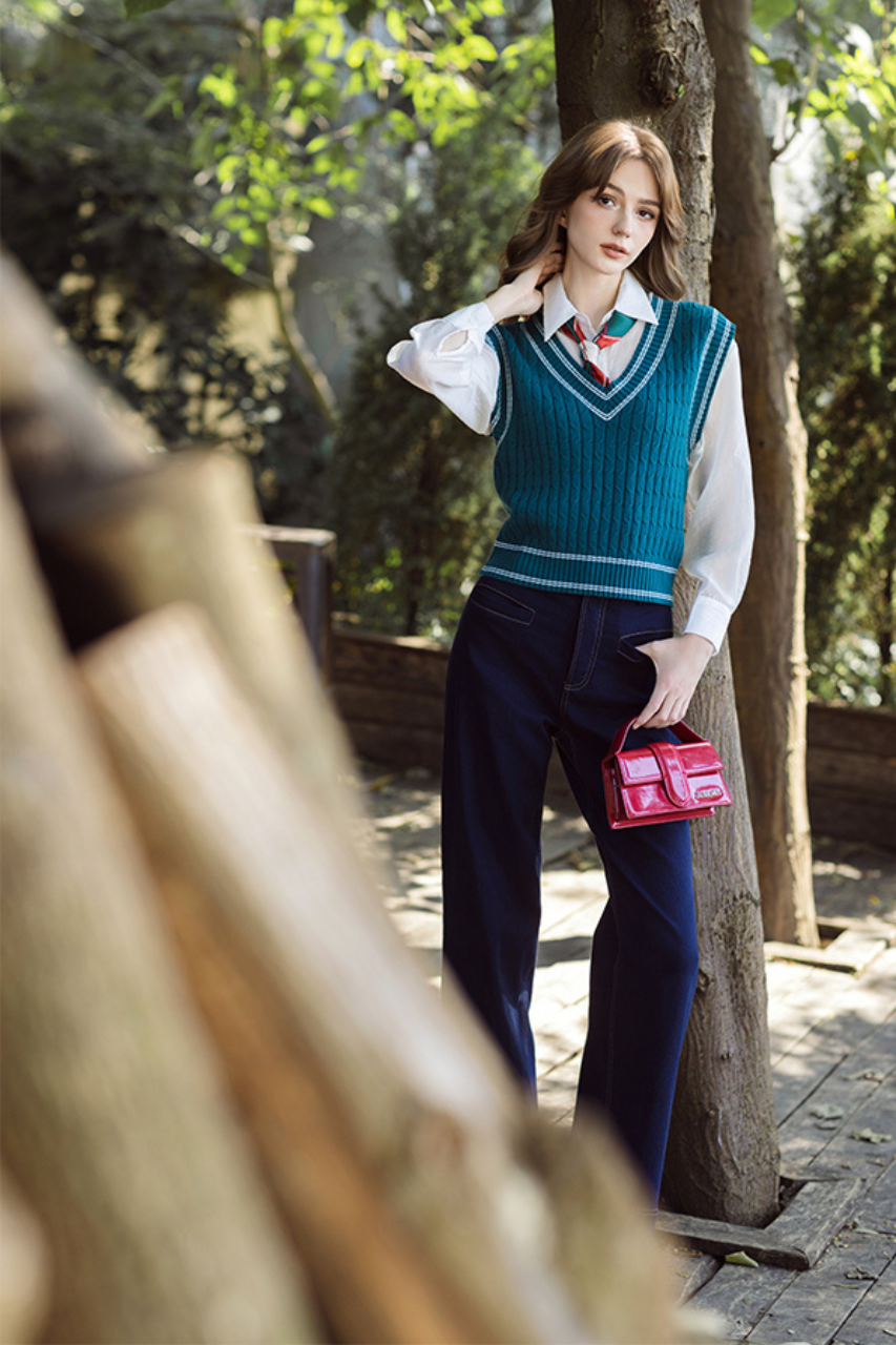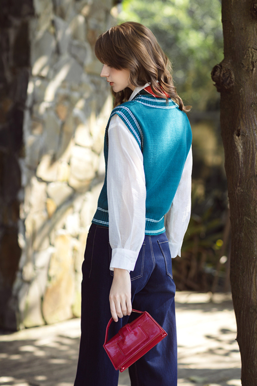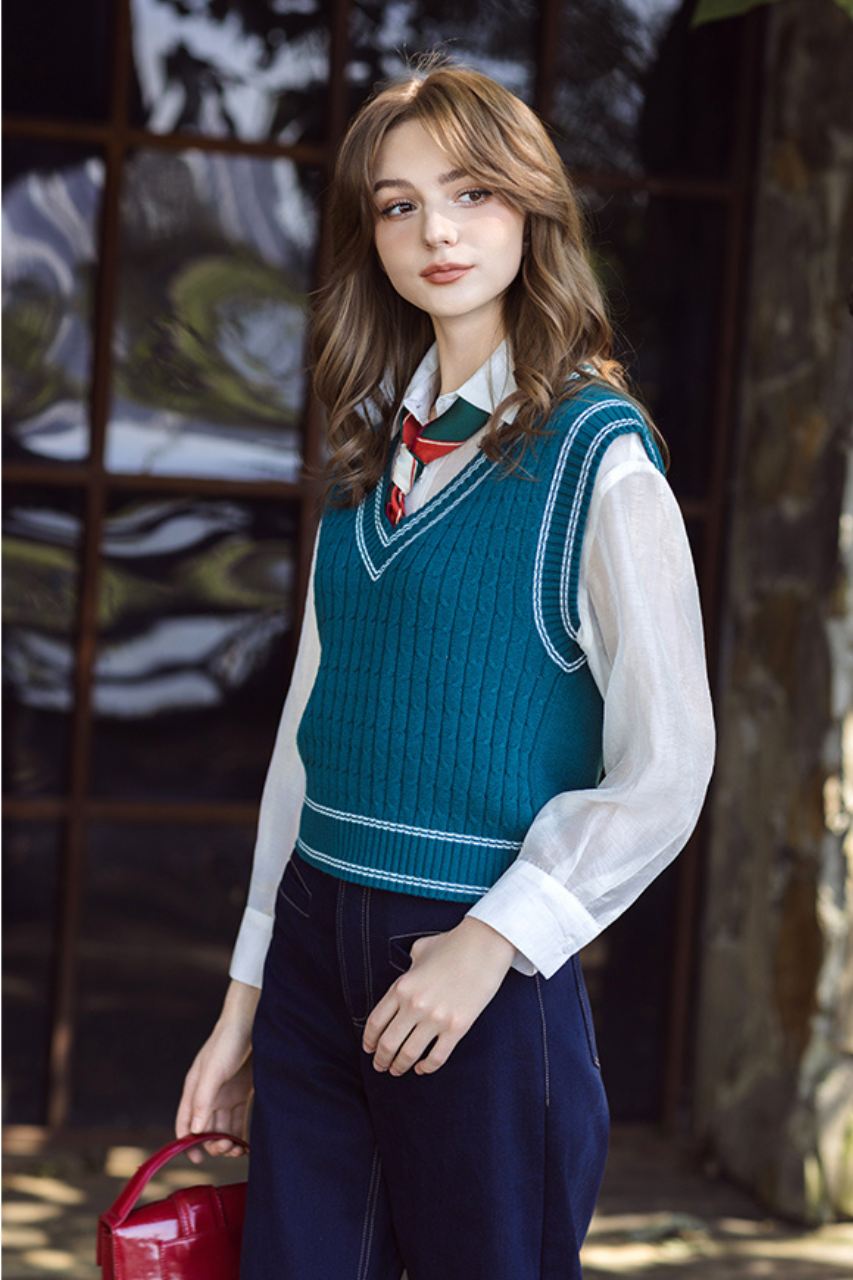 Áo gile len cổ tim rêu line trắng