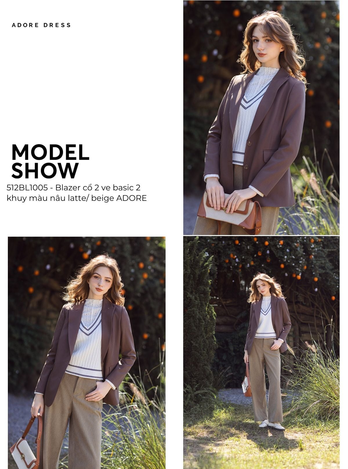 512BL1005 - Blazer cổ 2 ve basic 2 khuy màu nâu latte/ beige ADORE