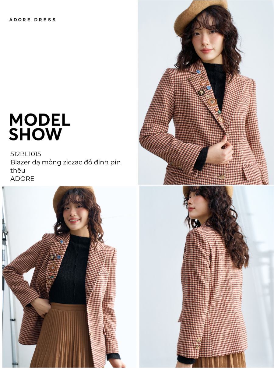 512BL1015 - Blazer dạ mỏng ziczac đỏ đính pin thêu Adore