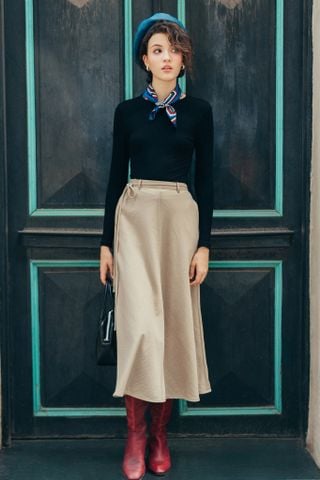 Chân váy midi A nâu be chạy mí giữa