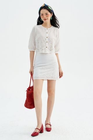 Chân váy mini thô trắng thêu bode gấu