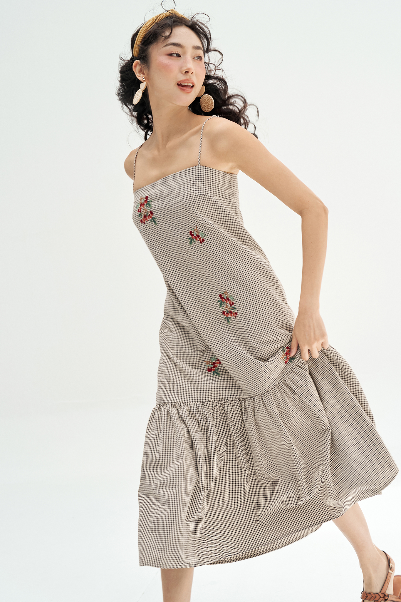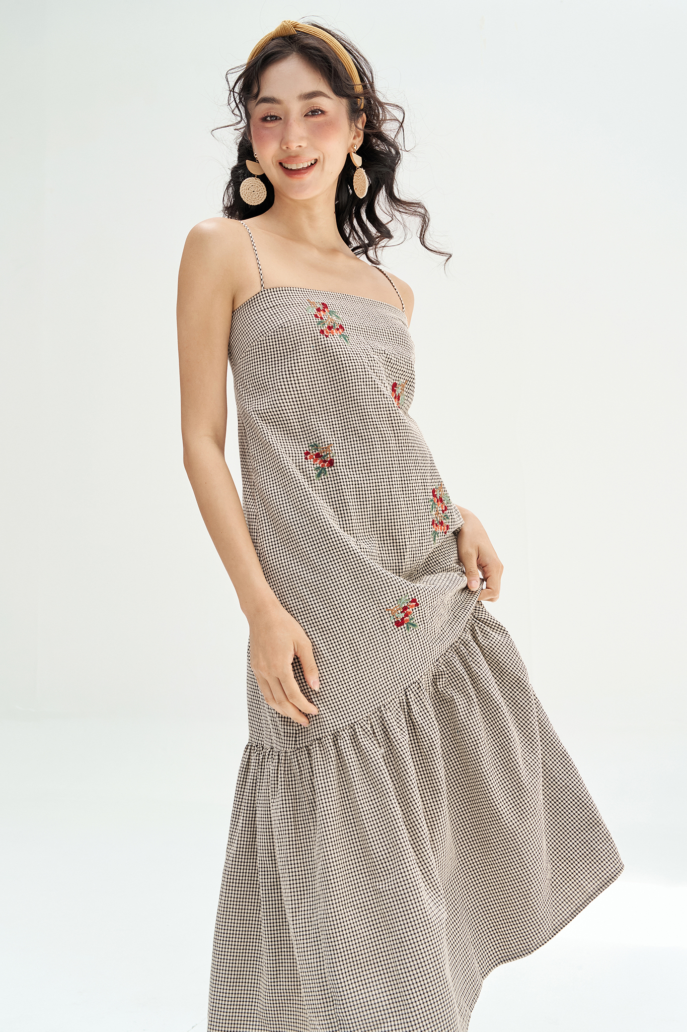 Đầm 2 dây karo nhí thêu chùm olive