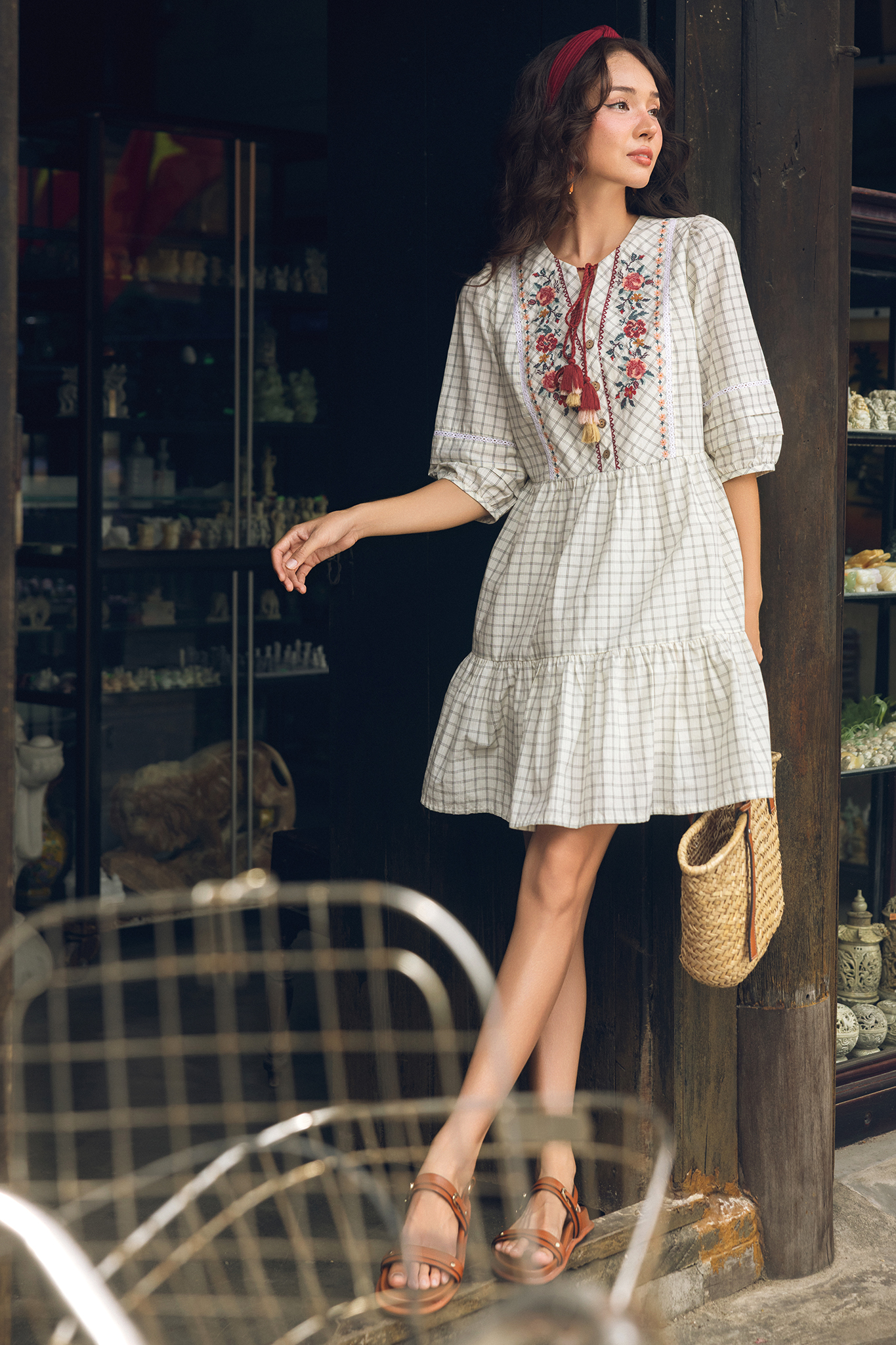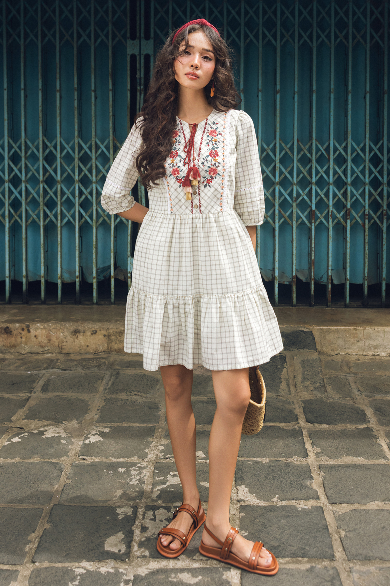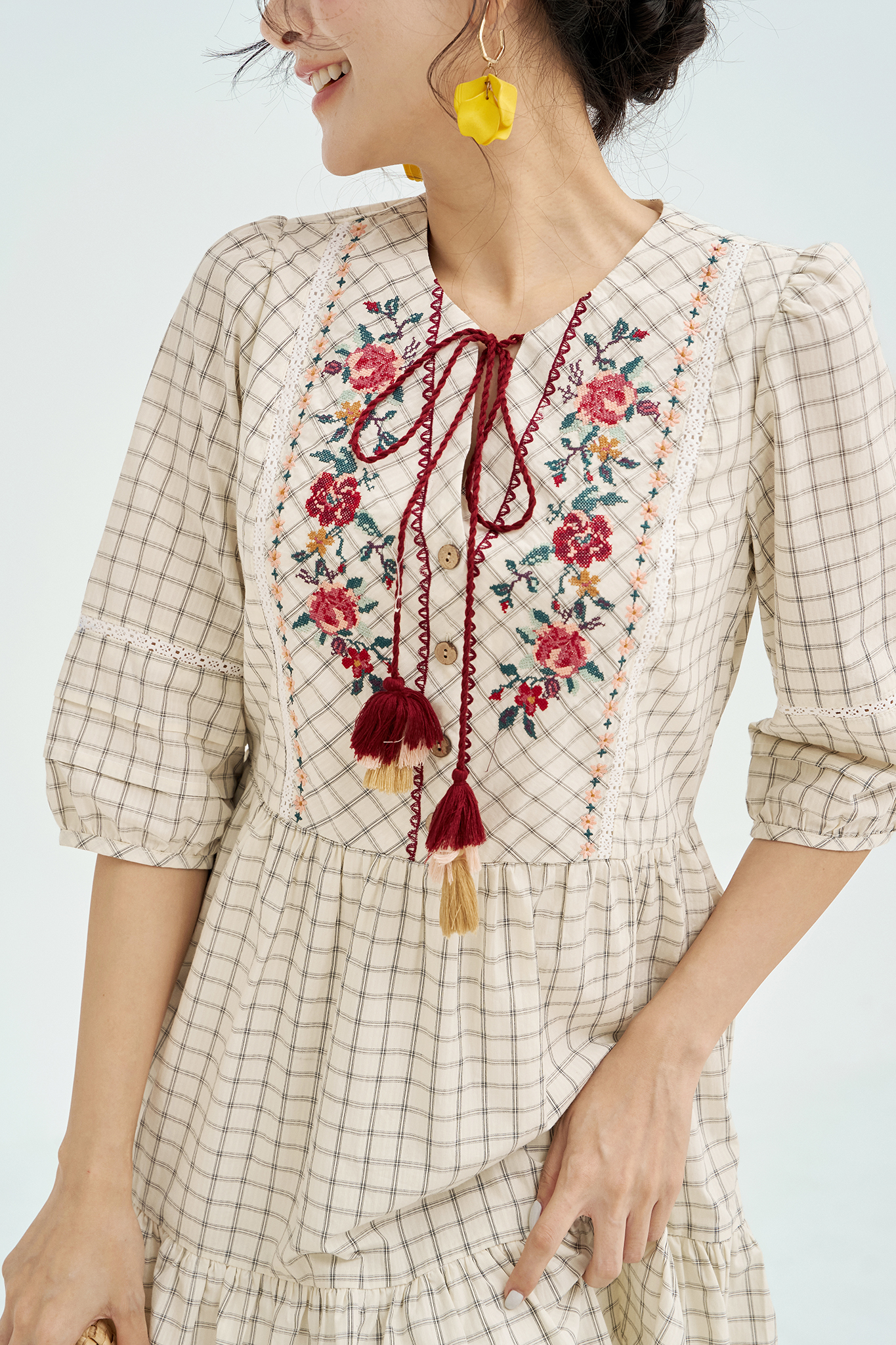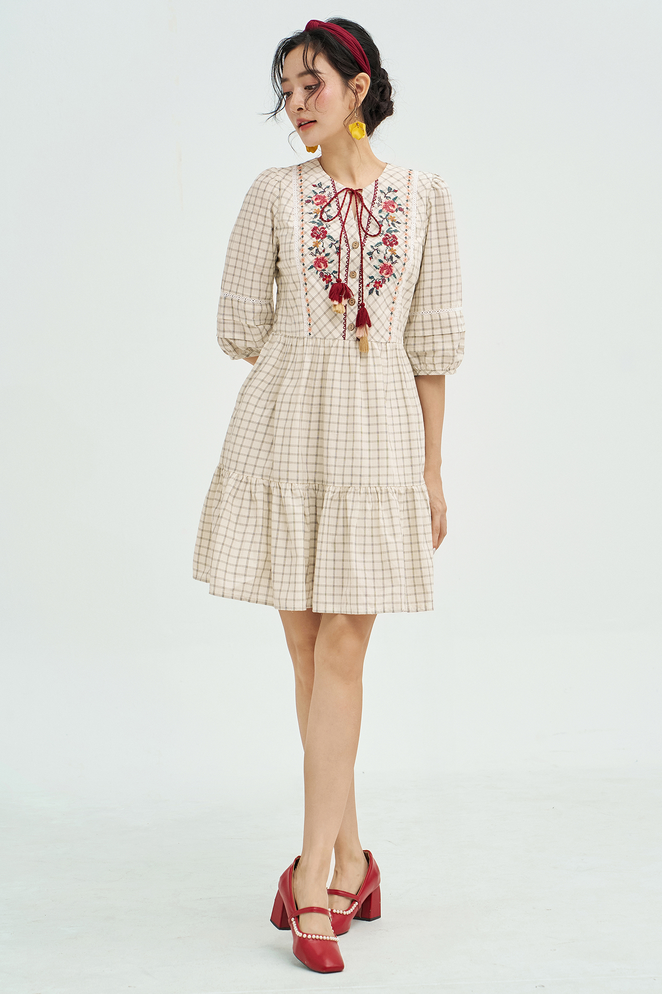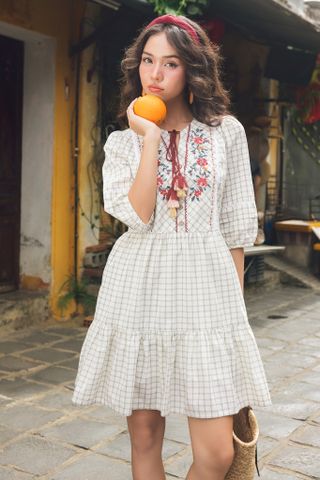 Đầm caro thêu diềm hoa vintage