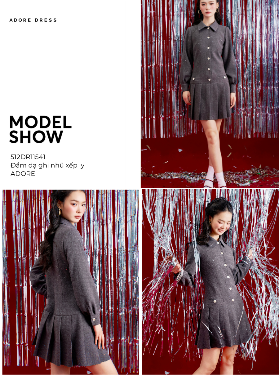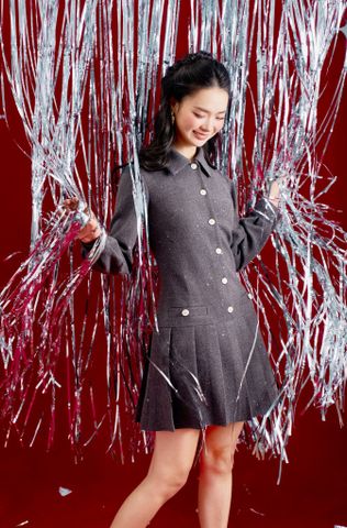 Đầm dạ ghi nhũ xếp ly Adore
