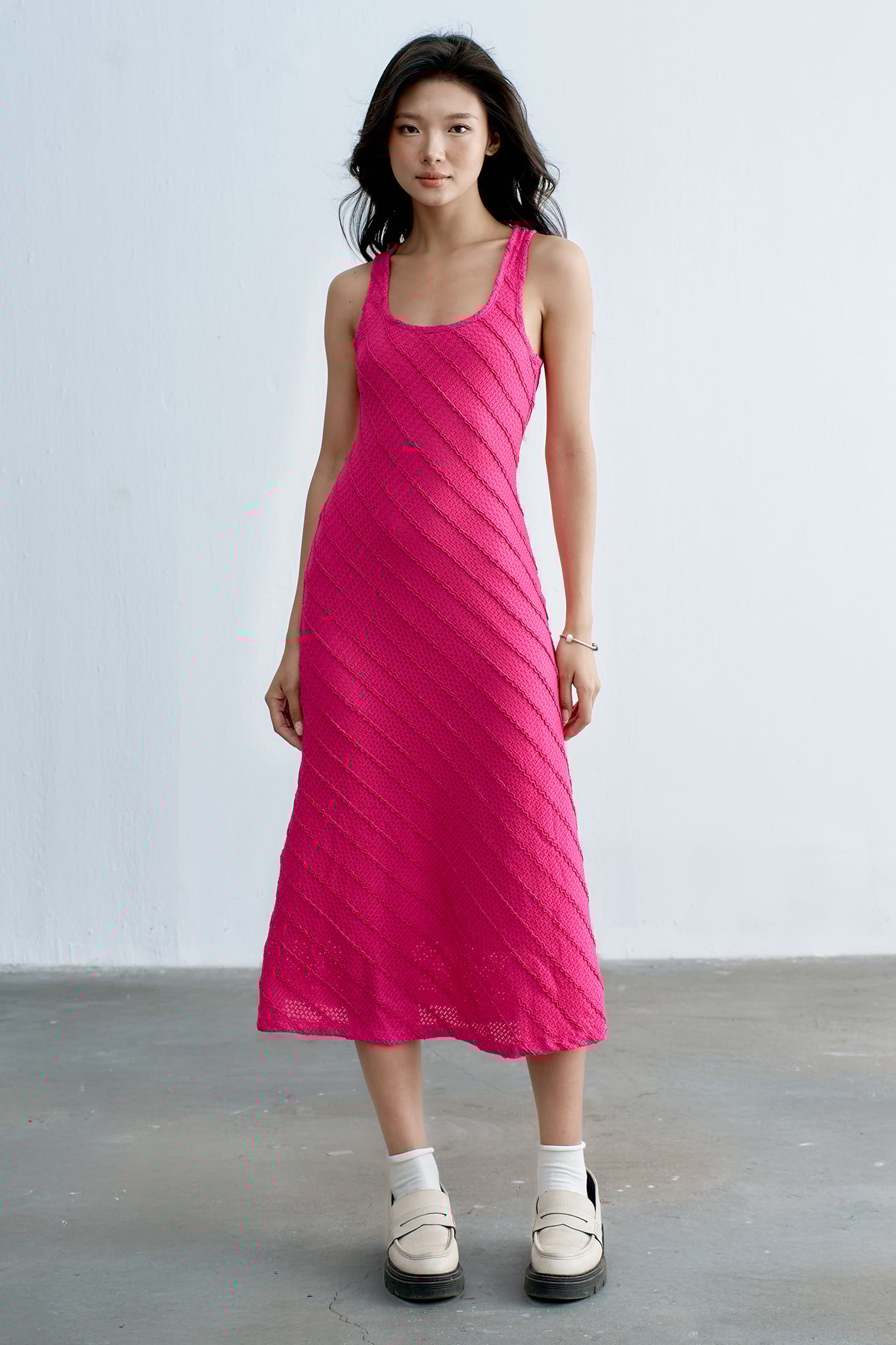 Đầm midi cổ U ren gân hồng đỗ quyên ( Form nhỏ)