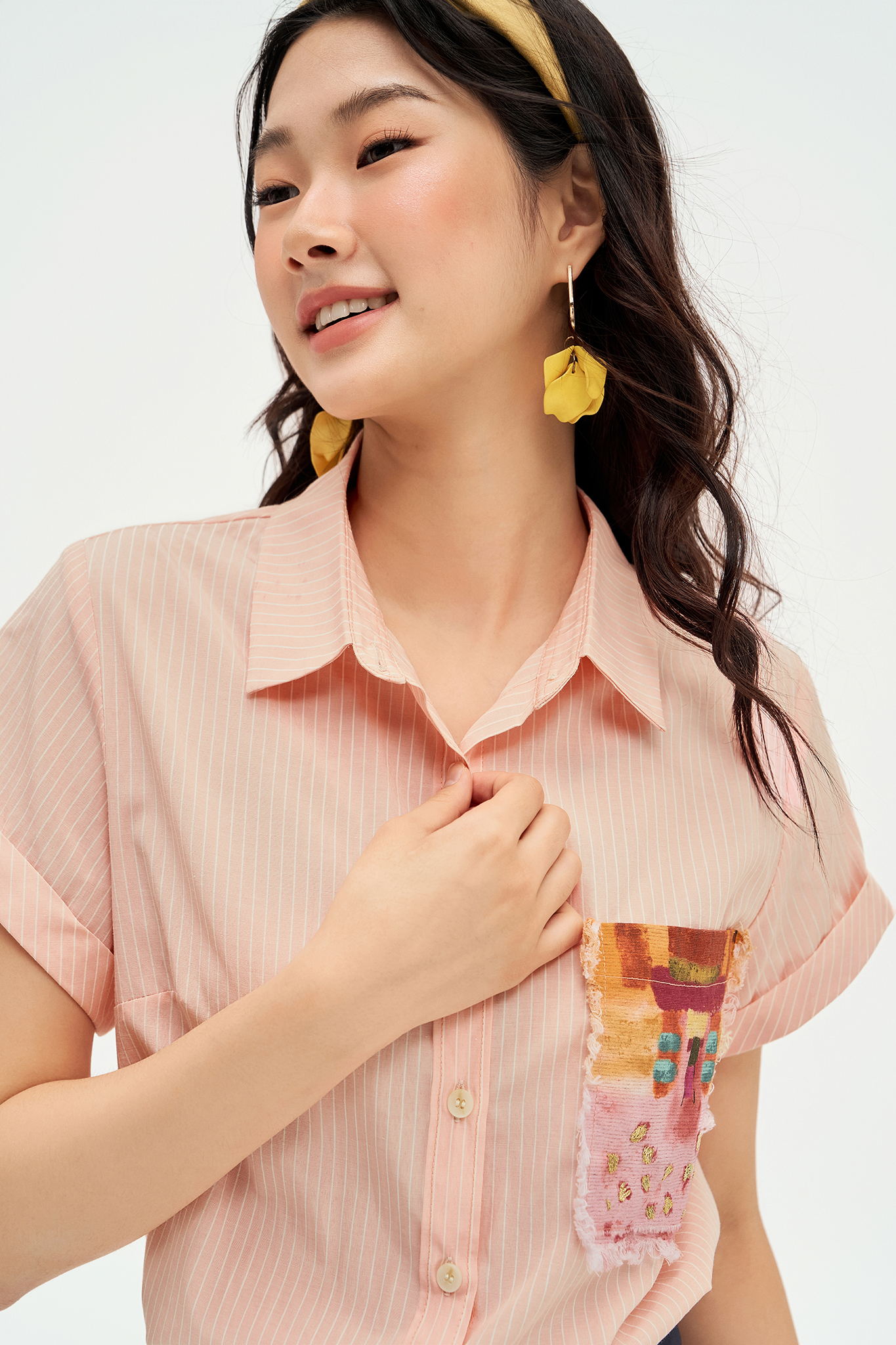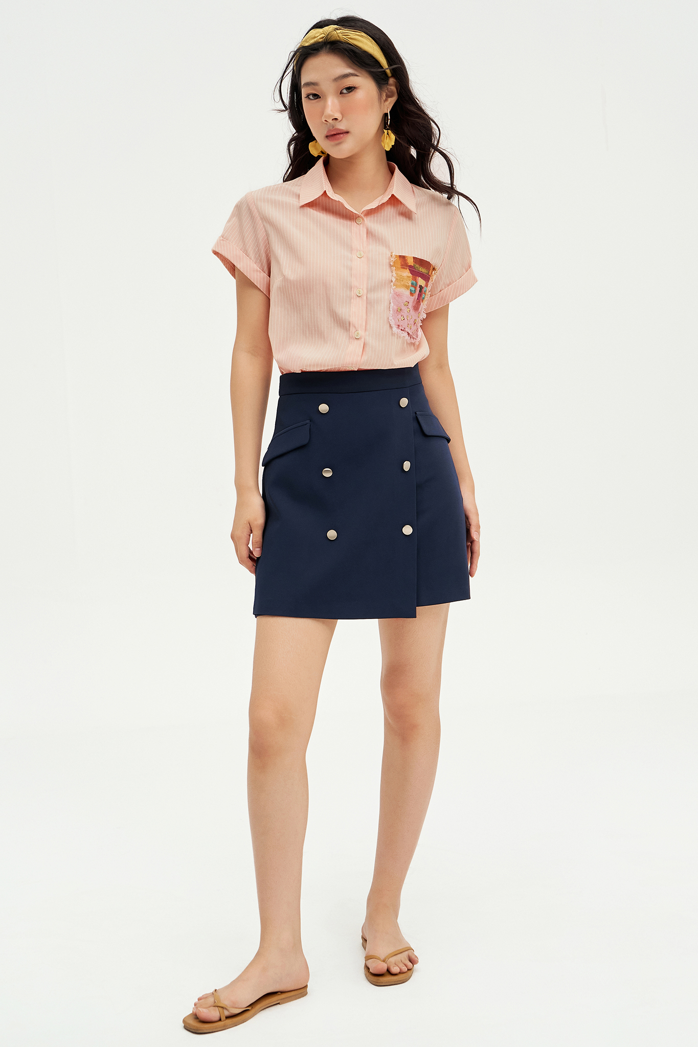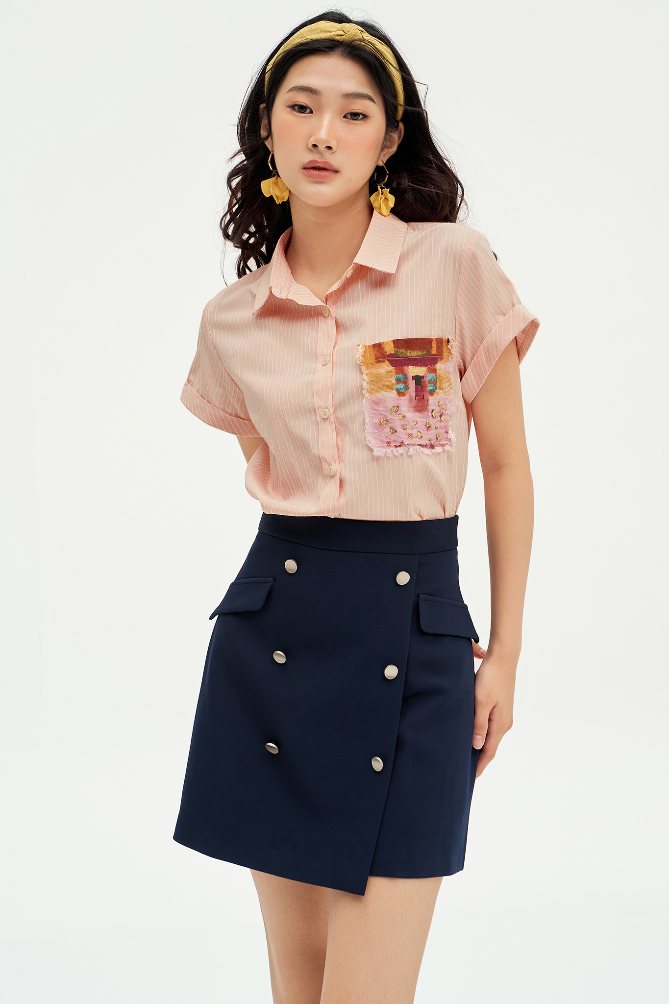 - FORM DÁNG: Áo sơ mi tay cộc lơ V, cổ đức, túi ốp trang trí in thêu