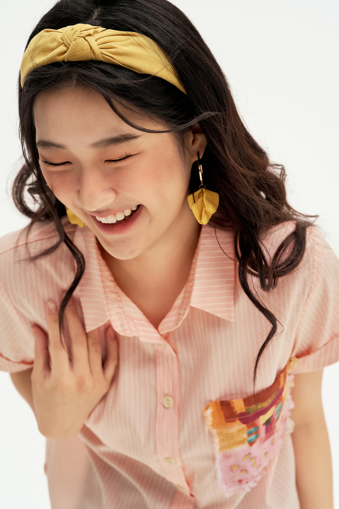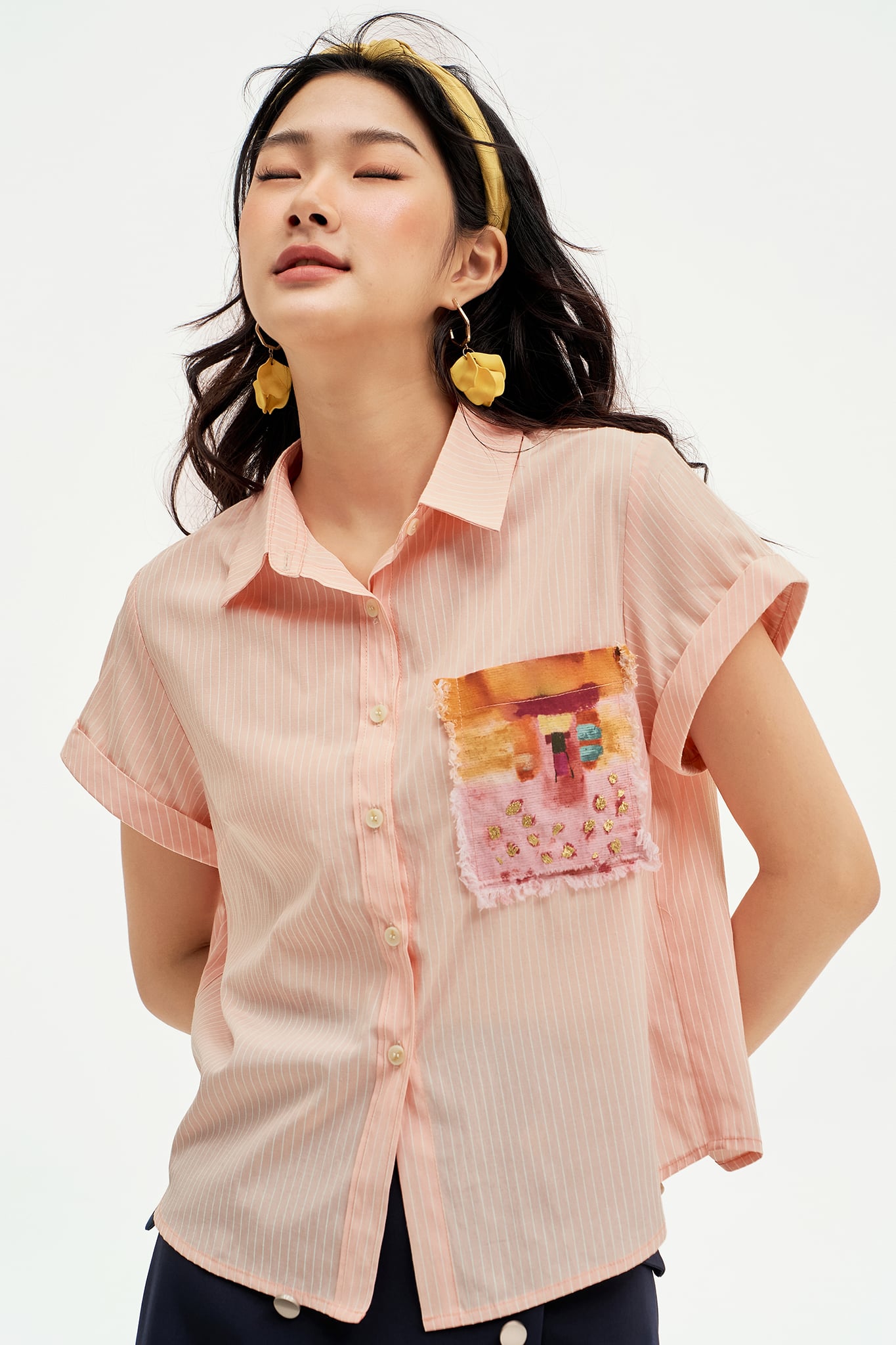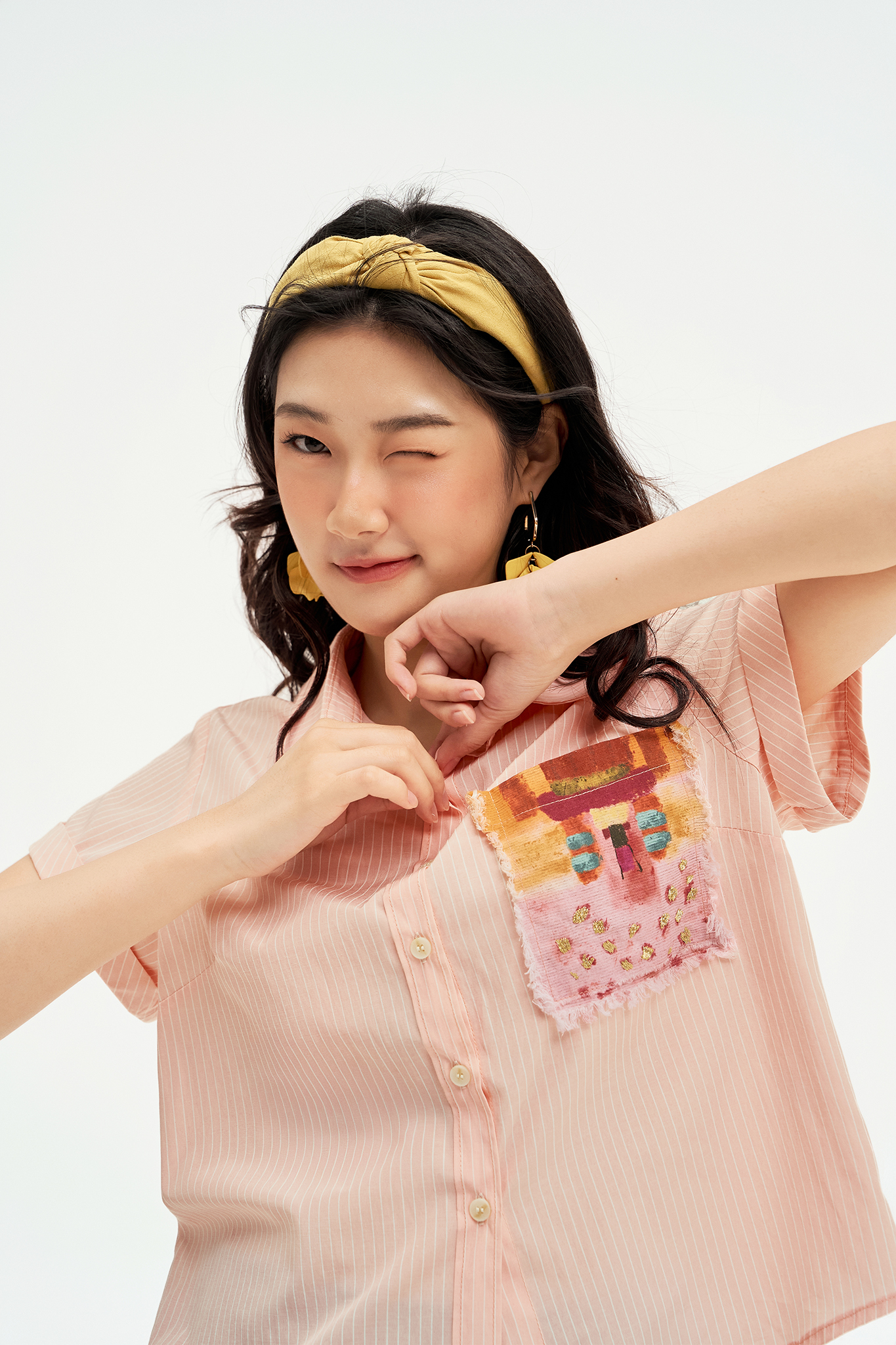 - FORM DÁNG: Áo sơ mi tay cộc lơ V, cổ đức, túi ốp trang trí in thêu