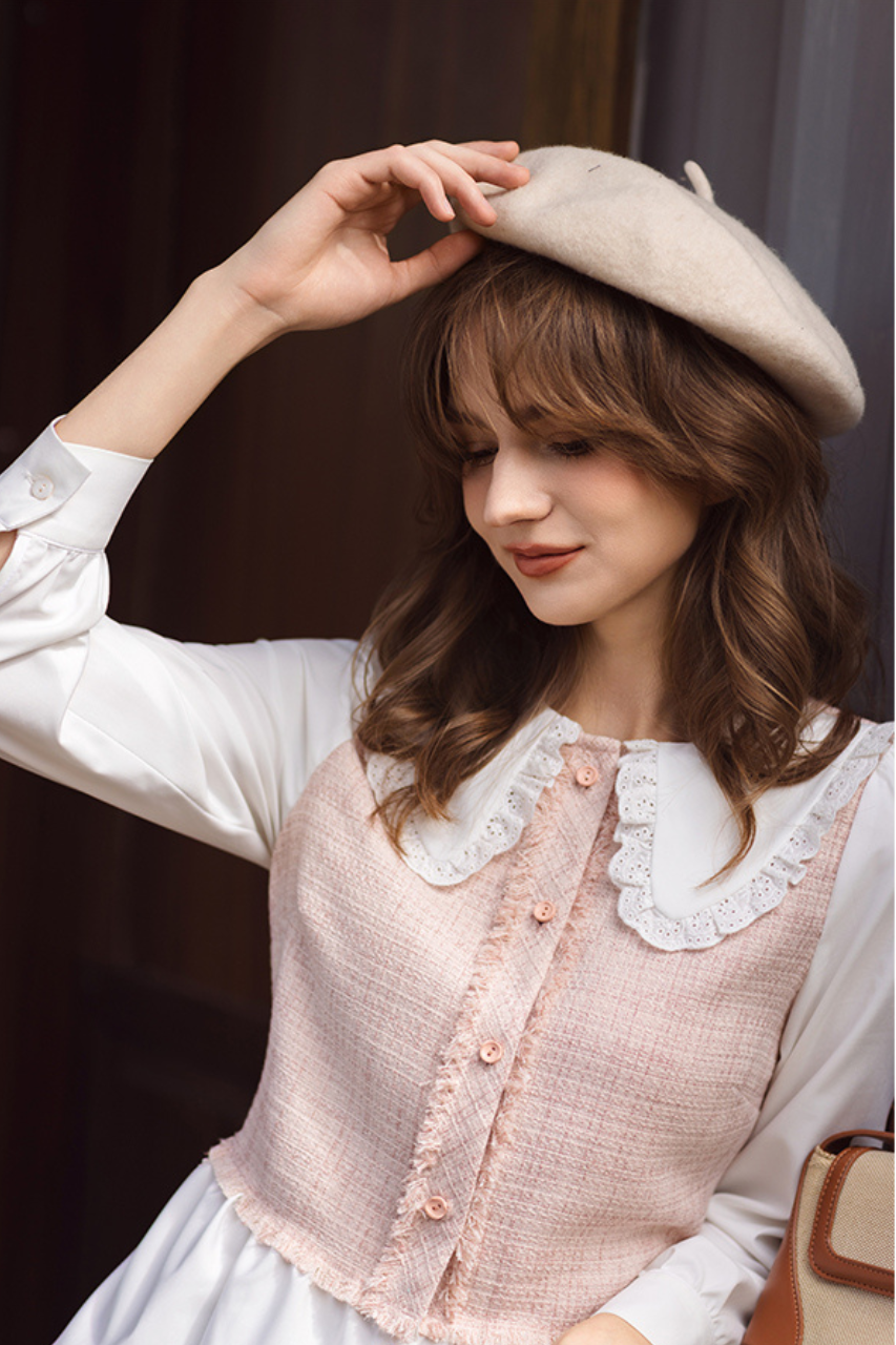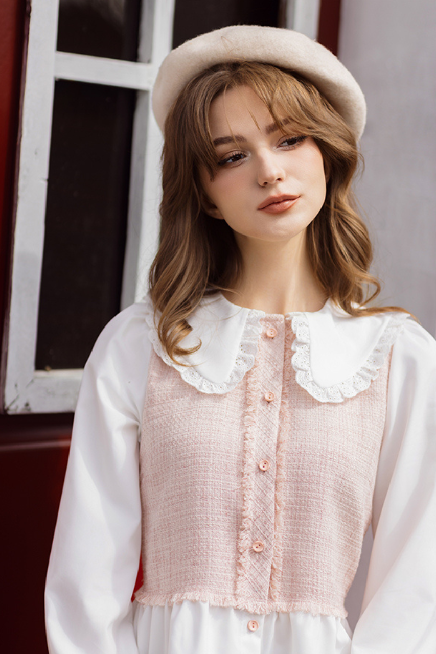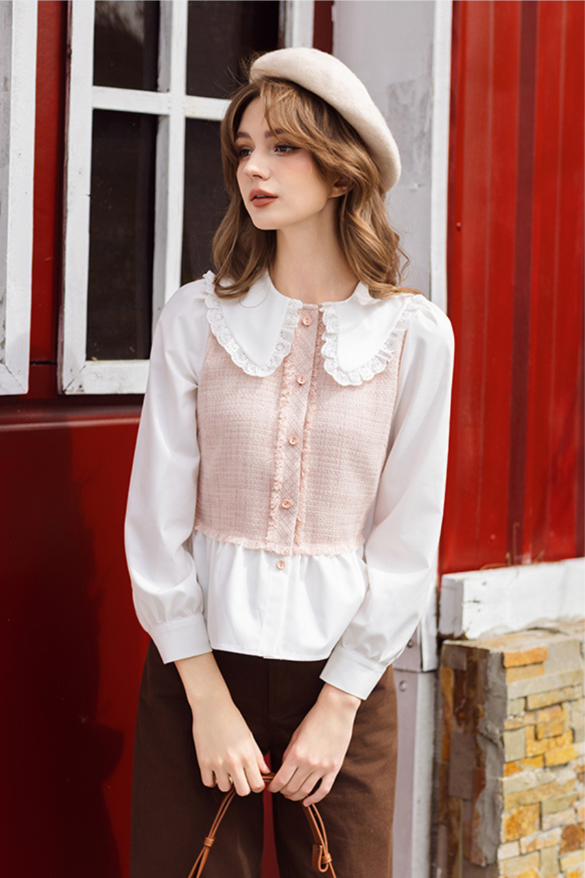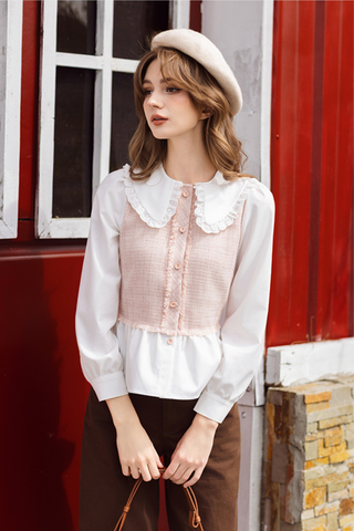 Sơ mi tech hồng nhạt phối cổ Peter pan