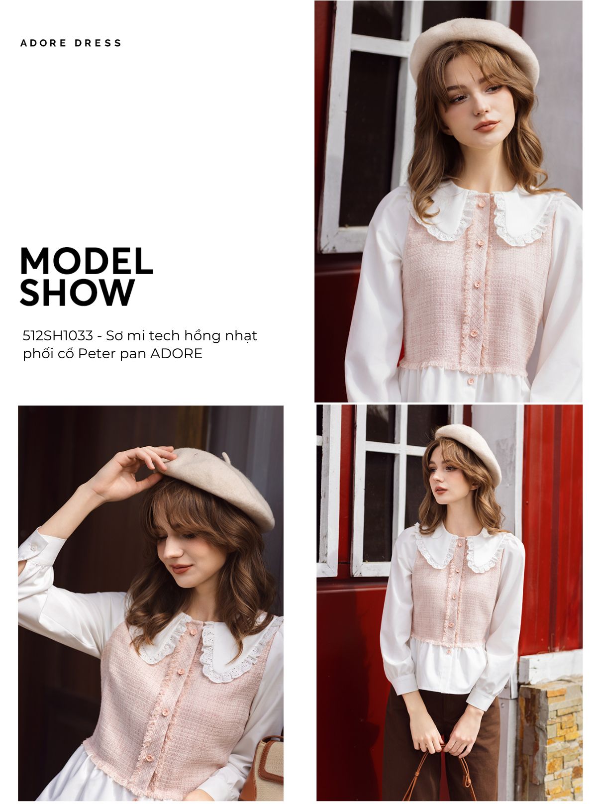 512SH1033 - Sơ mi tech hồng nhạt phối cổ Peter pan ADORE